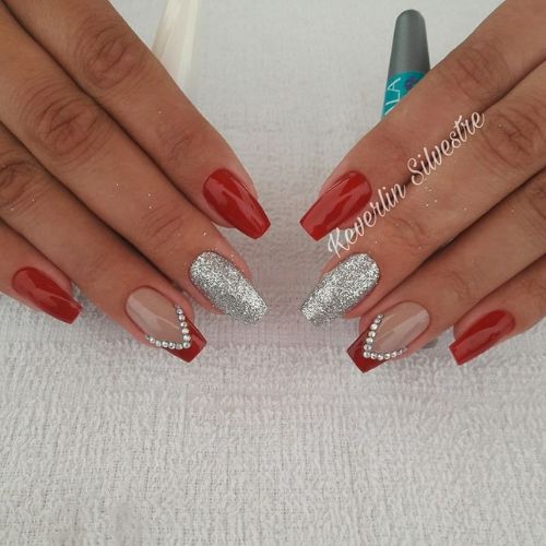 O visual do vermelho vibrante com glitter prata ficou mais delicadinho na unha bailarina, mas também fica poderoso quando aplicado nas unhas quadradas e compridas.