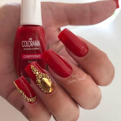 Nada mais sofisticado do que a combinação do vermelho com dourado. O que você acha? Nessa inspiração, a joia é usada como filha única para não ficar exagerado, já que as unhas são curtas.