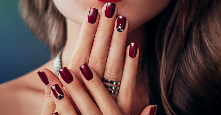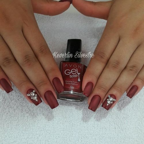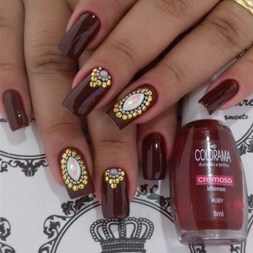 Quer visual mais poderoso do que essa combinação de esmalte vinho com as pedrinhas douradas e vermelhas? A filha única com base nude ajuda a dar ainda mais destaque na combinação.