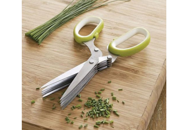 Esse utensílio é uma tesoura com várias lâminas para agilizar o corte do cheiro-verde. Parece uma revolução, mas a verdade é que tantas lâminas são menos práticas de lavar do que só a lâmina da faca, ainda mais porque o cheiro-verde fica grudado entre as lâminas. Pode ser prático em uma etapa, mas não na outra, e acaba ficando estocado na gaveta.