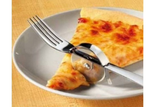 Já tinha visto um desse nas lojas de utensílios? Pode ser uma boa invenção para uma pessoa que não pode usar as duas mãos para cortar a pizza e outros alimentos, mas para quem é habituado com garfo e faca, certamente é inútil.
