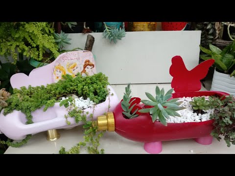 Vasos de plantas feitos com garrafa de amaciante