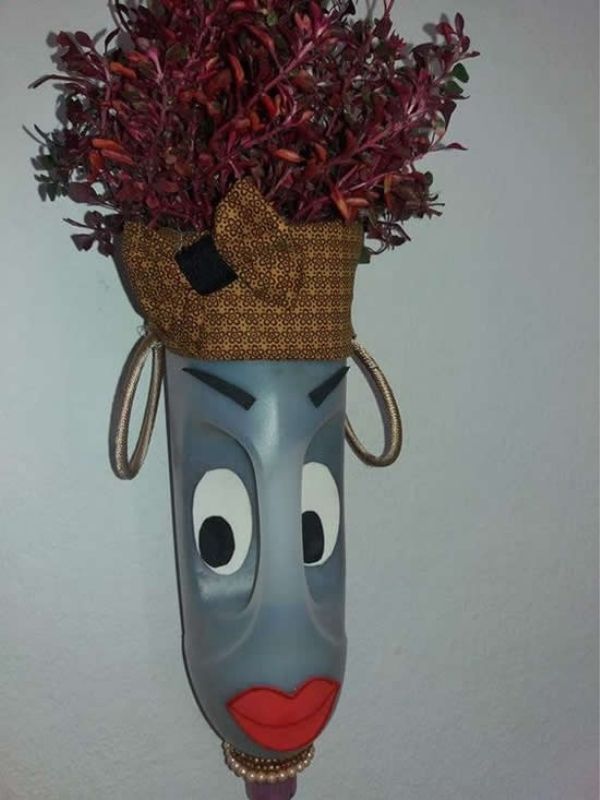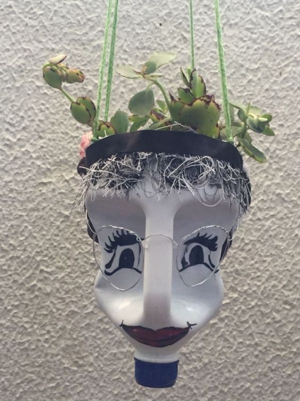 Além da ideia do rosto na garrafa, você também pode recortá-la de forma diferente e fazer uma floreira bem bonita: