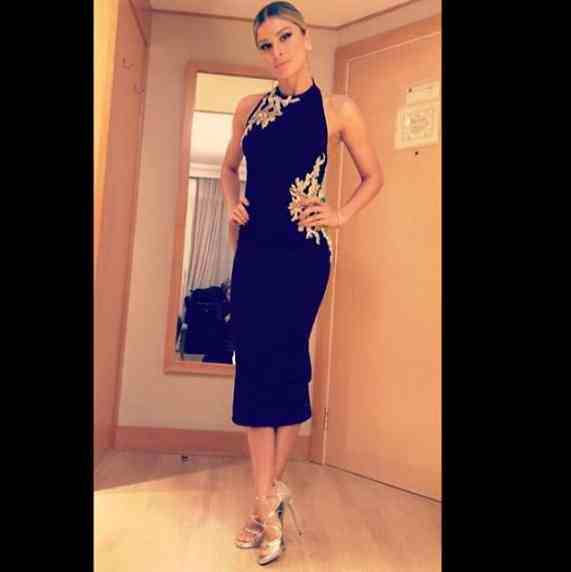 A atriz usou um vestido que marcava as formas do corpo com um comprimento midi que alcançava a parte debaixo dos joelhos. A parte de trás do vestido evidenciava um elegante decote profundo até à cintura. A parte frontal era fechada junto do pescoço, deixando-o um pouco mais sério. É um vestido da grife Balmain para NK Store. Tem o custo de R$ 22.190,80, ou seja, o preço do carro mais popular no Brasil, na sua versão básica.