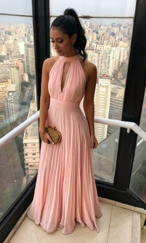 Esse tom de rosa puxando para o salmão é a cor perfeita para valorizar as morenas e ganhou mais vida com o tecido crepe e suas lindas dobrinhas plissadas.