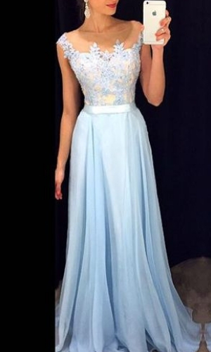Outro modelo com renda na parte de cima e tecido liso e leve na parte de baixo, esse tom de azul deixa o visual delicado, especialmente por causa do acabamento com fita de cetim na cintura.