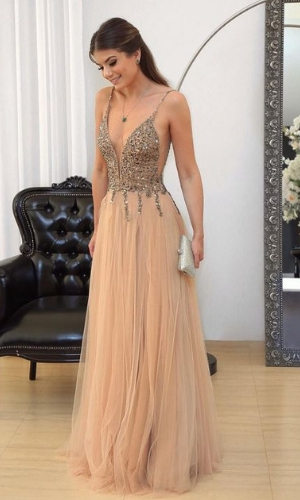 O bege jamais fica sem graça em um vestido como esse. Saia de princesa em tule fino e busto com decote marcado todo em pedrarias. Um misto de ousadia com delicadeza.