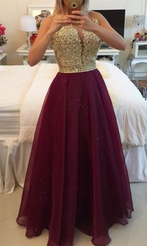 A combinação de vinho com dourado é linda para destacar uma formanda. Nem precisa de muitas joias para complementar, pois o vestido por si só é o brilho do visual.