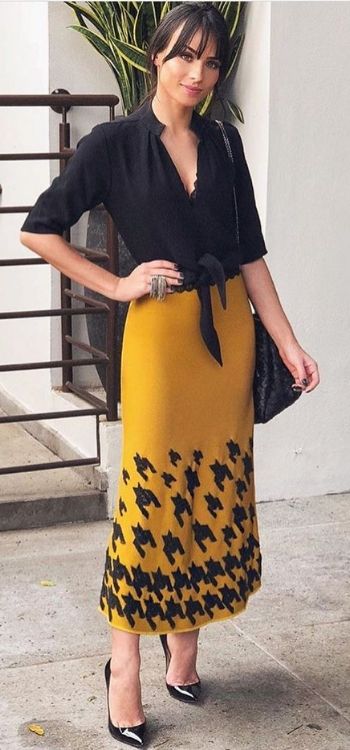 Mulheres com uma rotina agitada gostam de se sentir à vontade, mas sempre com estilo. Um look com blusa preta amarradinha e saia fica incrível para qualquer ocasião.