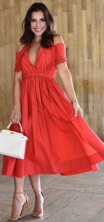 Para as tardes de sol ou de chuva, um vestido vermelho sempre desperta o bom humor. Se for rodado, então, uma alegria extra. O modelo médio é mais confortável do que o curto, já que não precisa ficar segurando para não levantar. O longo também fica lindo, ainda mais em evidência.