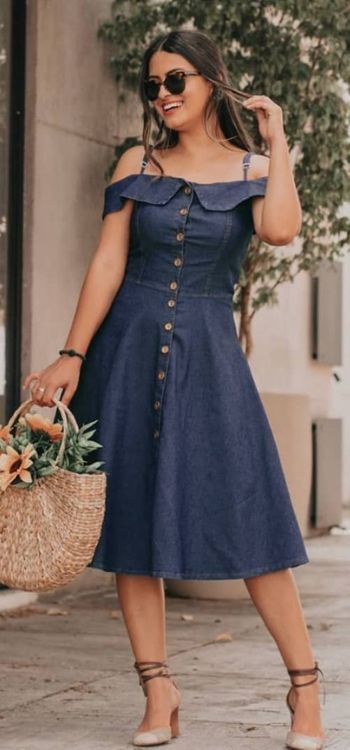 Vestidos feitos com tecido jeans ficam uma graça, em especial quando os modelos são como esse da foto, um pouco rodado, assenta bem na cintura e as mangas são delicadas, levemente ousadas, mas bem confortáveis.
