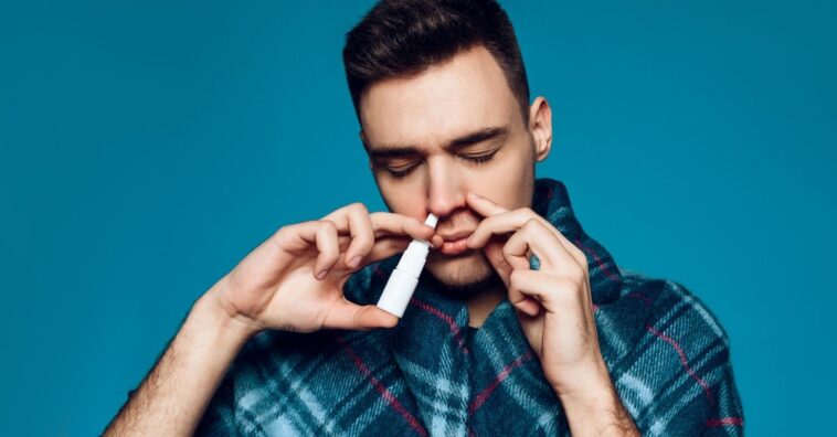 - Coloque no interior de uma narina, colocando a cabeça para trás, de modo que o medicamento chegue à garganta e ao nariz.